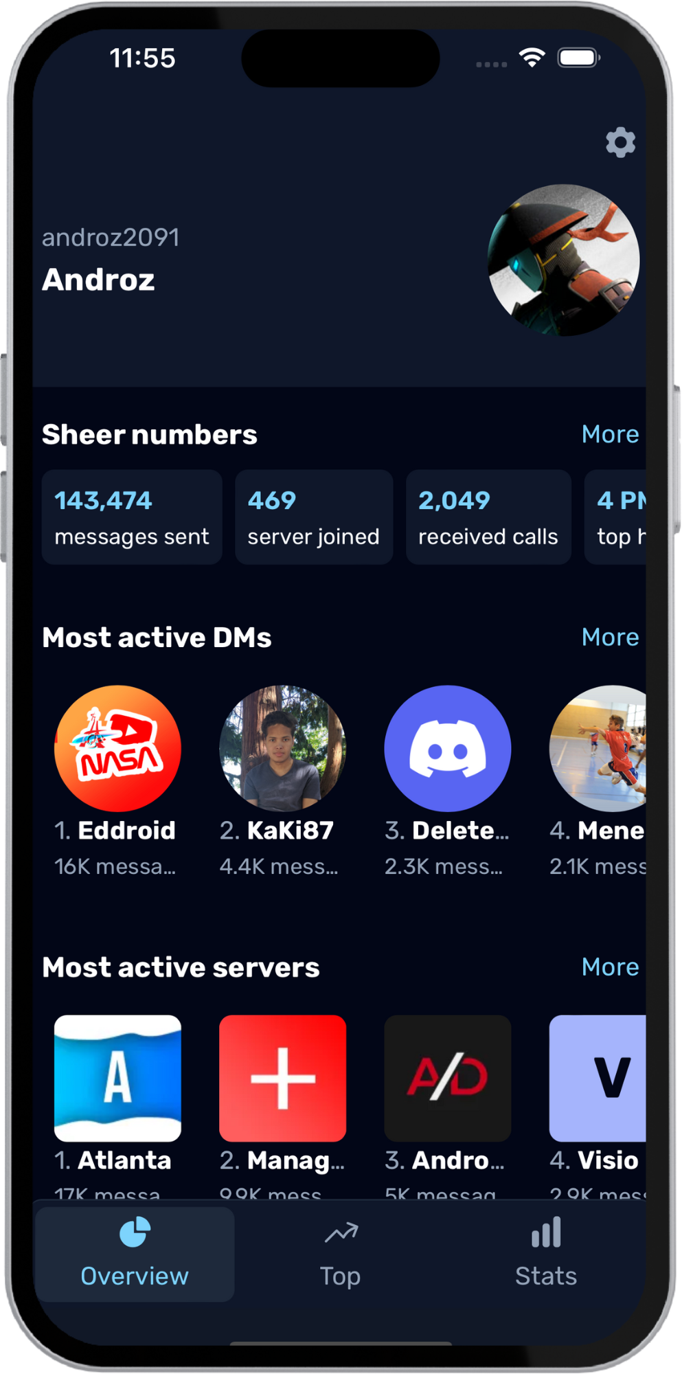 Check which servers and users you talk the most on/with. Calculated with machine learning based on, you can also get the chat sentiment score.
