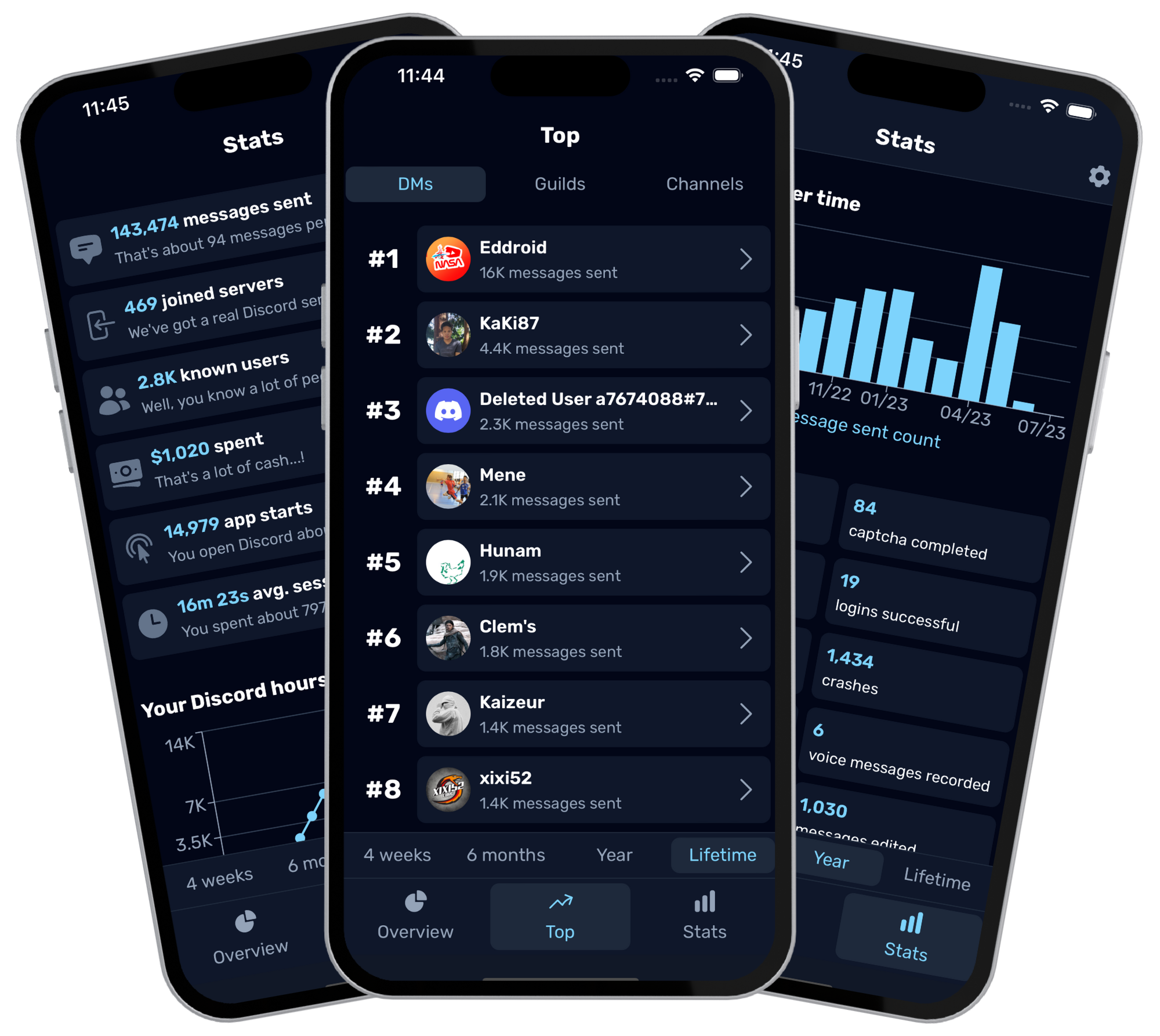 See what time of day you're most active, and check your Discord activity over time with graphs.